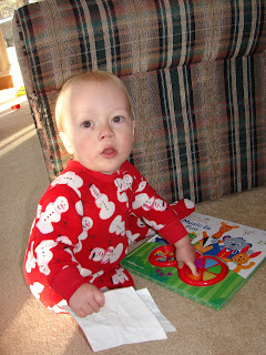 Have you ever had the urge to press the buttons on one of those "musical sound effect" books? N and his Auntie K LOVE them! Here's N playing with one this morning. This time, we discovered that it makes a monkey sound (ooo-ooh, aaa-aahh) and a blaa-blaa-blaa sound!
