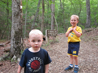 We spent last weekend cabin-camping. Favorite memories are the way the kids explored the cabin when we first arrived - played on the bunk beds, loved the porch, thought it was so neat to eat the big wooden table...eating spaghetti and hamburgers and big breakfasts...hiking around the cabin area and teaching the kids to recognize trail blazes...